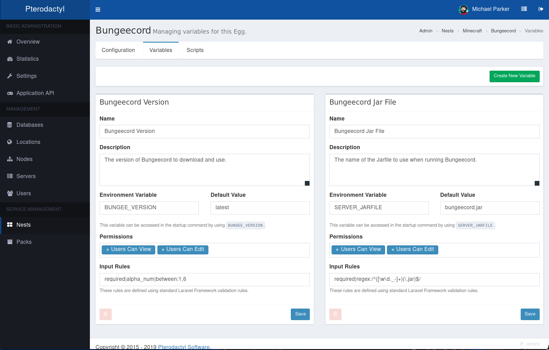 变量的一大优点是能够定义用户/管理员可以定义的特定变量,在不用让用户修改启动命令的情况下调整不同的设置。创建新变量或编辑现有的变量,请访问您创建的服务器预设界面,然后单击页面顶部的 变量 按钮。我们可以在一些例子里看看可以创建的变量示例。