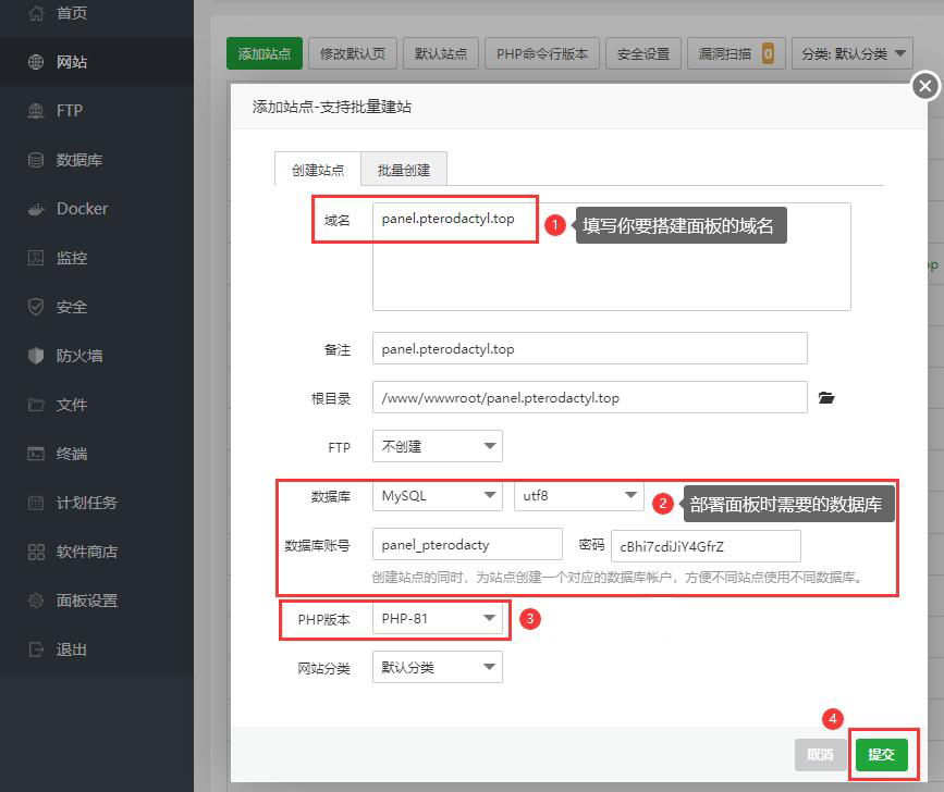 在进行以下步骤之前,请阁下为面板前端新建一个数据库,我相信阁下的聪明脑袋一定会用宝塔面板新建一个数据库吧。