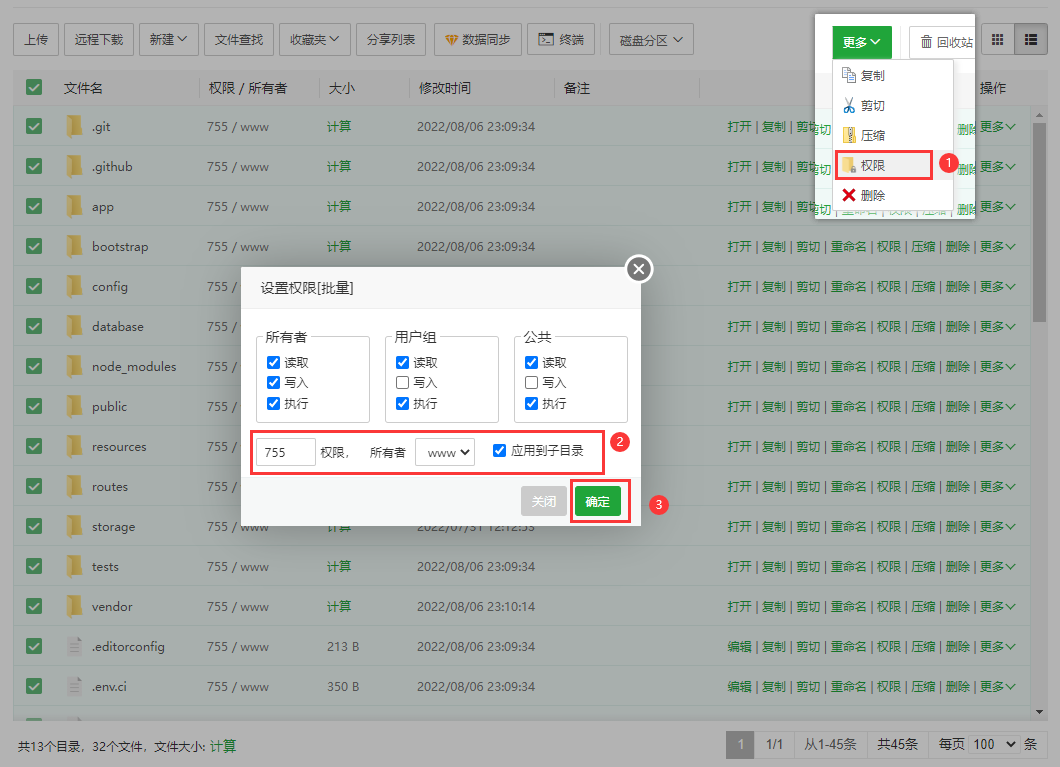 我们需要进入网站目录并全选设置文件权限为 755 所有者为 www