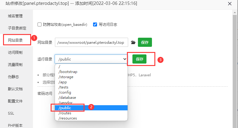 点击 运行目录 一栏,并选择 /public 点击 保存 即可设置成功。